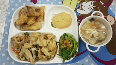 小米飯(280卡) 燒梅花肉(195卡) 宮保雙脆(95卡) 蚵白菜(70卡) 牛蒡湯(90卡) 哈密瓜(60)